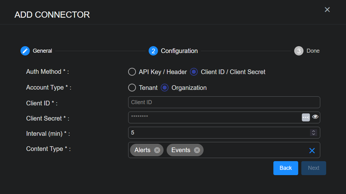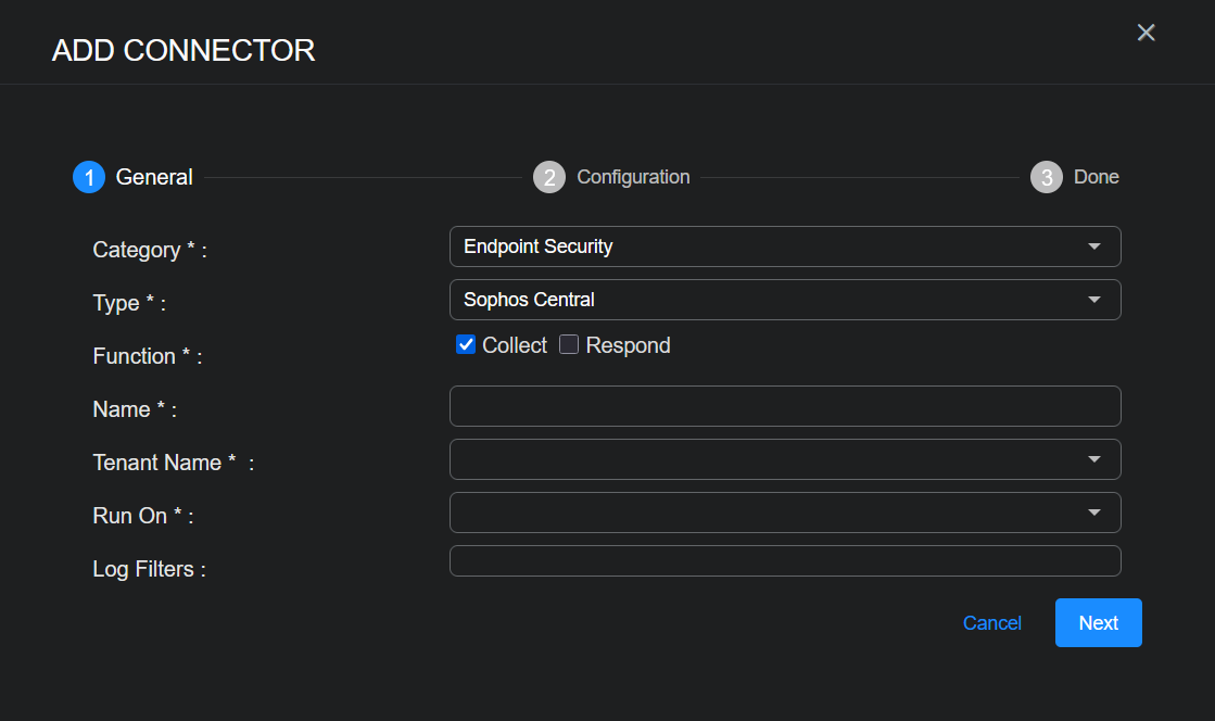 With the information ready, you can add a Sophos Central connector in Stellar Cyber: