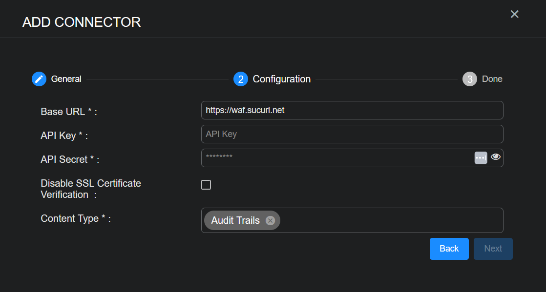 • API Key and API Secret—Sucuri Security API Key and Secret Key used to authenticate your account.