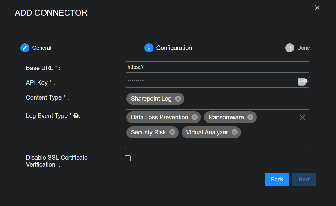 15. Choose the Log Event Type you would like to collect. This is the event type for ingesting logs data. The event types for Data Loss Prevention, Ransomware, Security Risk, and Virtual Analyzer are supported.