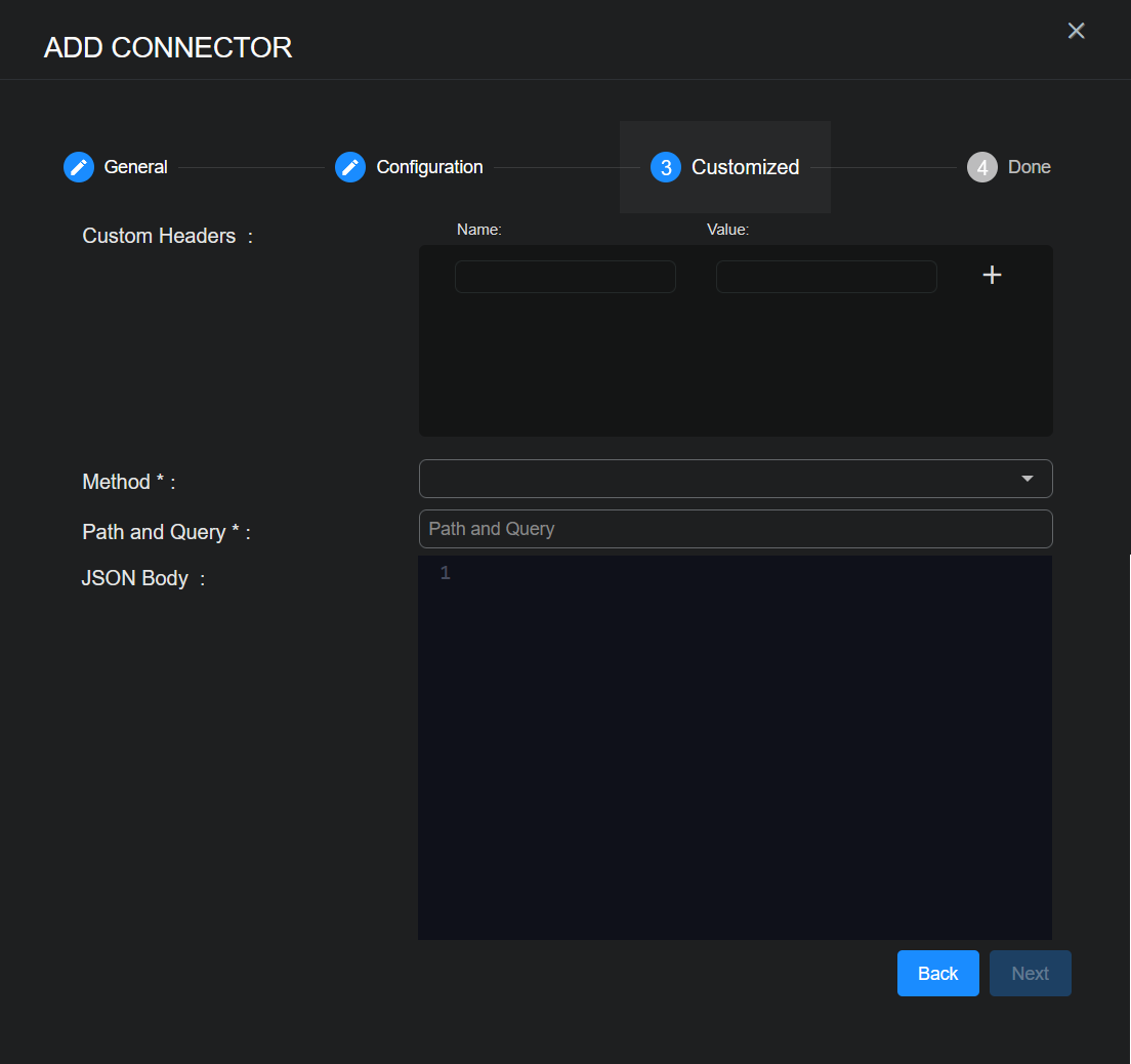 1. (Optional) Enter Custom Headers. Enter Name and Value. Click the button to add multiple pairs of Name and Value.