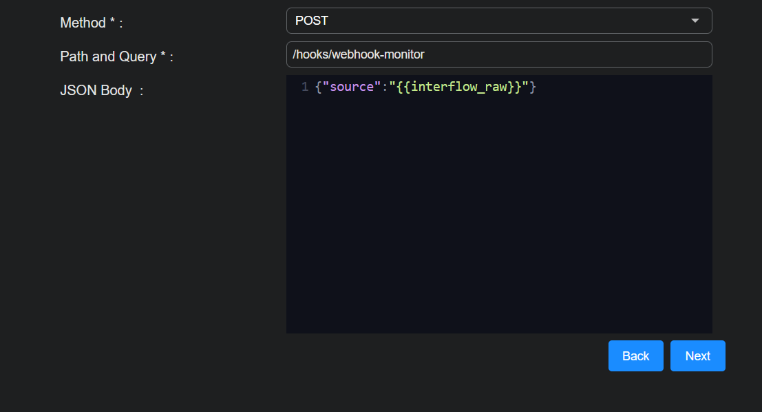 To send the raw Interflow record as the payload of the webhook request as a JSON object, use the following syntax in the JSON Body: {"source": "{{interflow_raw}}"}.