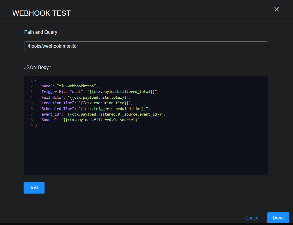 4. When you click Test, the Webhook Test dialog box opens. It is pre-populated with the original configuration of the custom webhook responder. You can modify the Path and Query and the JSON Body for testing purposes. In the following example, you can replace the field in double curly braces, {{microsoft_defender.id}}, with a real value.