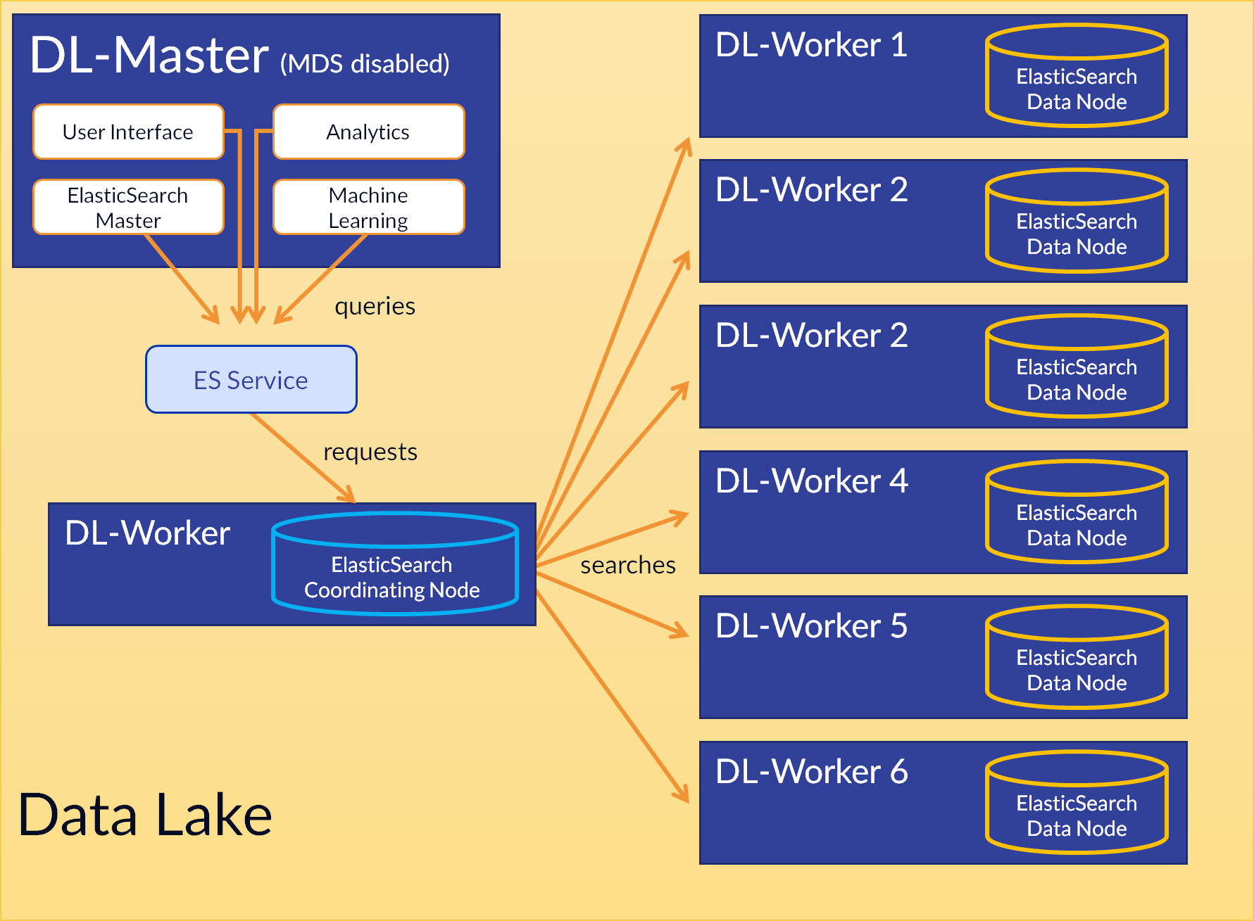 A Data Lake Coordinating Node (DL-CN) is a special type of Data Lake worker that does not store any ElasticSearch data itself, but instead focuses on coordinating data searches and requests from different DP services to the data nodes in the cluster. The DL-CN offloads that responsibility from the data nodes themselves, improving overall Data Lake performance.