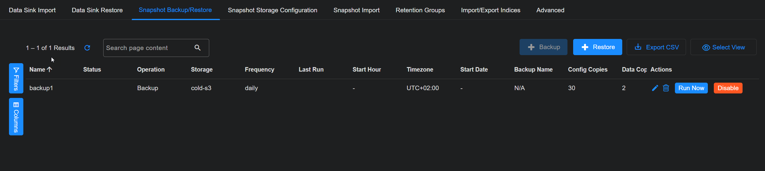 The Snapshot Backup/Restore tab was named Backup/Restore prior to the 4.3.1 release.