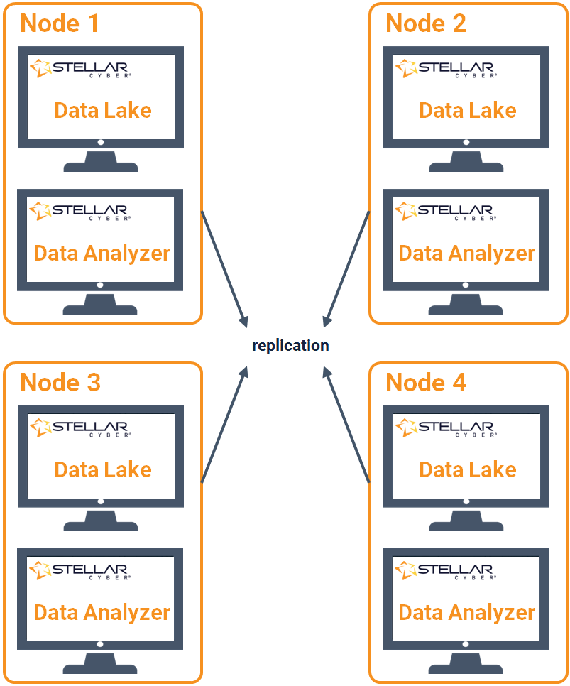 Both the DA and DL clusters can span multiple nodes for scalability and reliability. Stellar Cyber's clustered architecture lends itself to easy configuration of standby servers for both DL and DA nodes, as well as replication of data across nodes in the cluster to ensure high data availability.