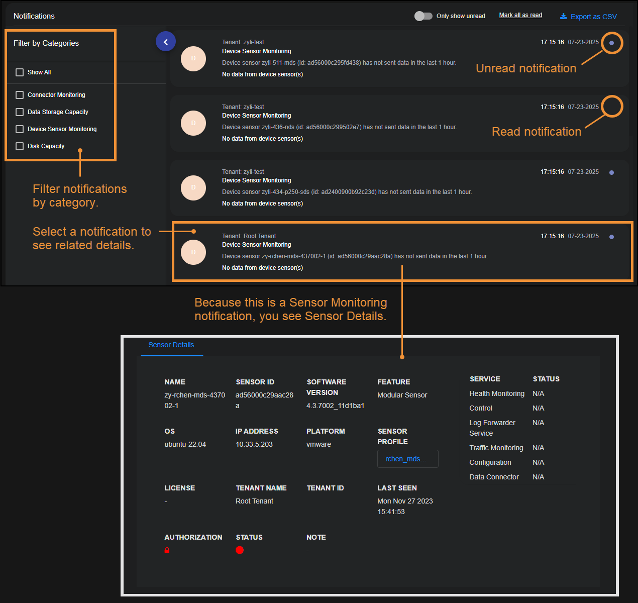 Selecting a Device Sensor or Server Sensor notification takes you to the Sensor Details page for the corresponding sensor.
