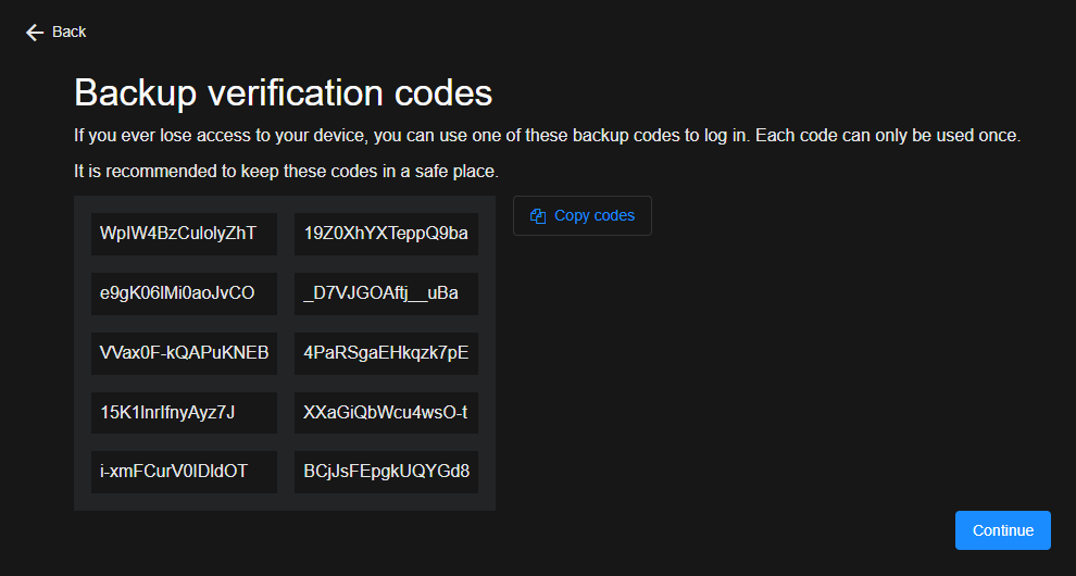 Stellar Cyber displays backup verification codes. These are one-time codes you can use if you do not have access to the authentication app.