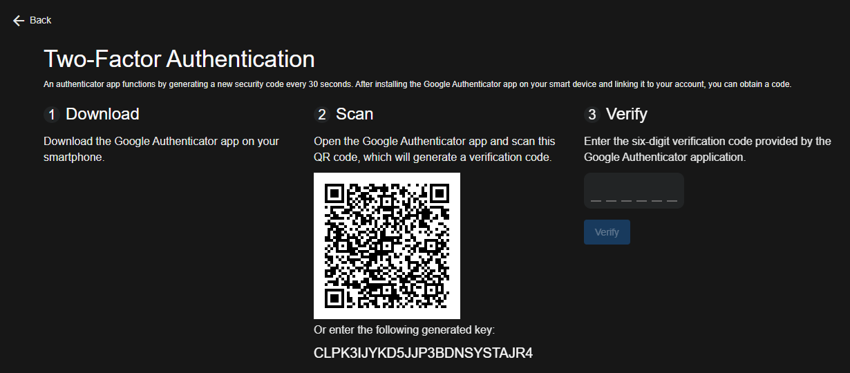 When 2FA is enabled for your account, the following panel appears the first time you log in: