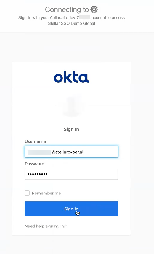 • When the serveris configured globally to use SSO, and there are no tenant-specific authentication overrides, Stellar Cyber is automatically loaded without further authentication. (Unless the tenant/user has NOT already logged into the global SSO. In that case, a login screen similar to the one below is displayed.) If the IDP setting of the server is set to both Authentication and Authorization, any tenant-specific authorization methods are not applied.
