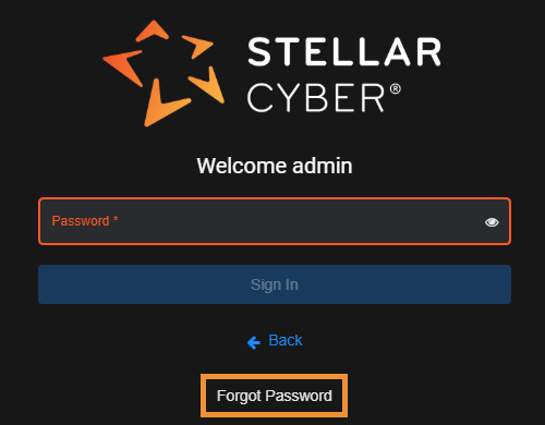 User accounts with Local authentication can request a password reset using the Forgot Password link on the Password screen. This link appears after using the main login screen to supply an email address that exists in the Stellar Cyber database and selecting Next.