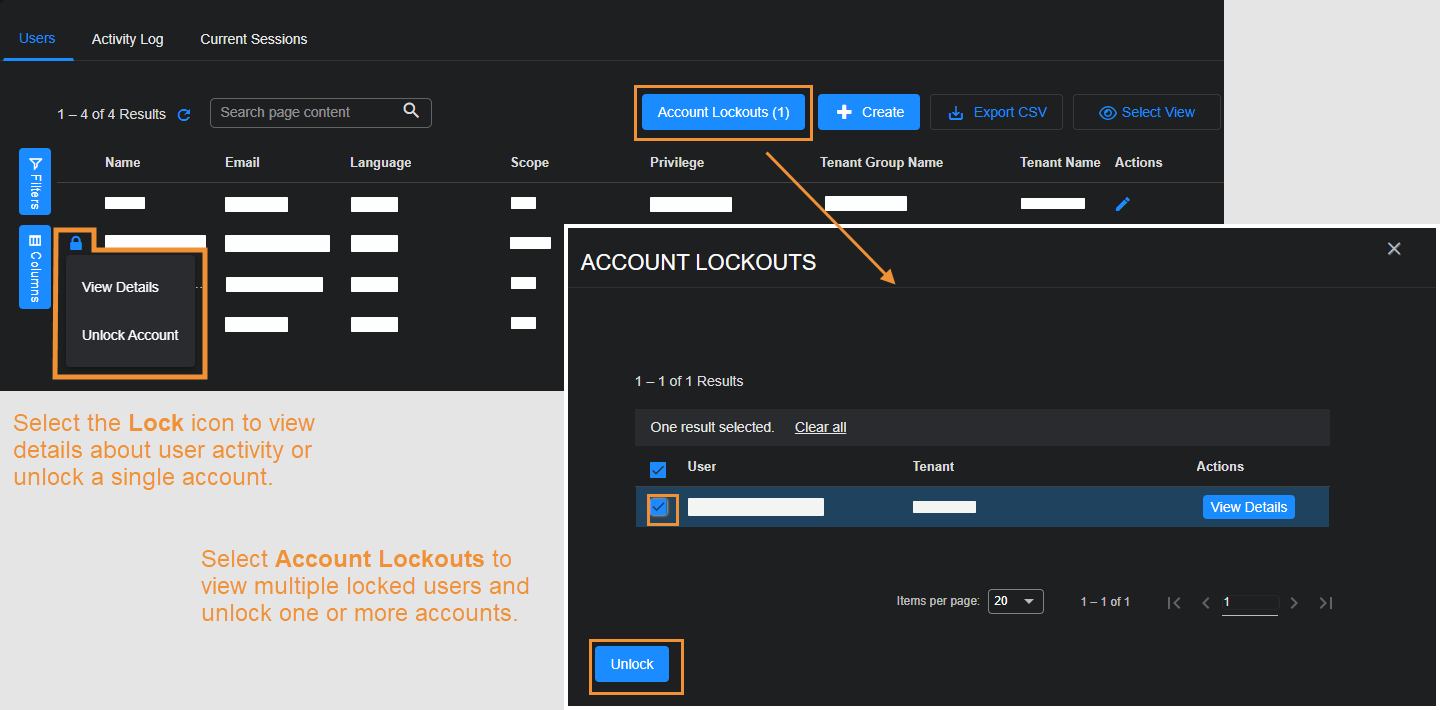 • After a lockout has occurred, a small lock icon appears to the left of a user's table entry and the Account Lockouts button is enabled. Select the lock icon to view the user's activity or to unlock the account. You can also select the Account Lockouts button to display the activity log for a single user, or select one or more users unlock them all at the same time.