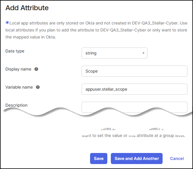 • Choose Authentication Only for Stellar Cyber to authenticate users from your IdP, but manage scope and privilege locally. If you choose this, you must create the user in Stellar Cyber before adding them to your IdP.