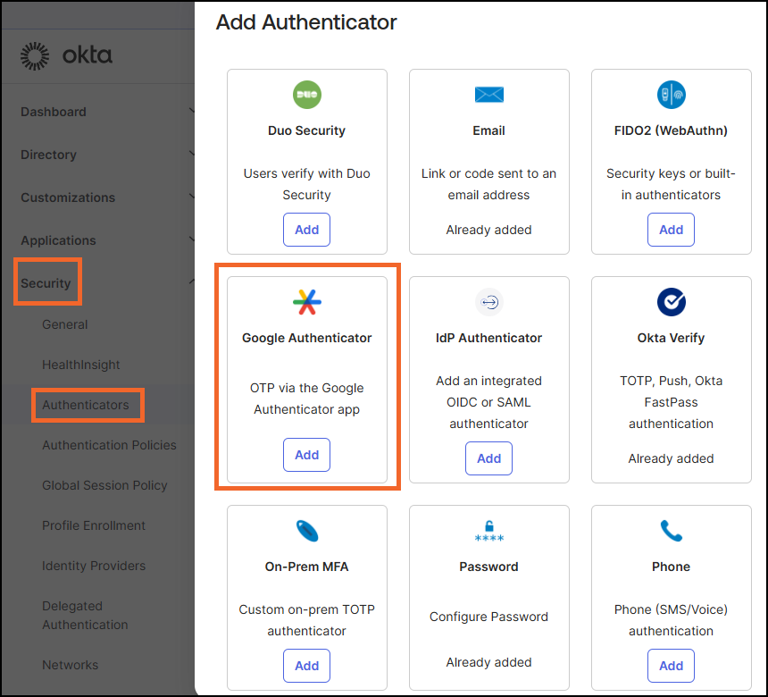 Screen capture of the "Add Authenticator" page in the Okta UI