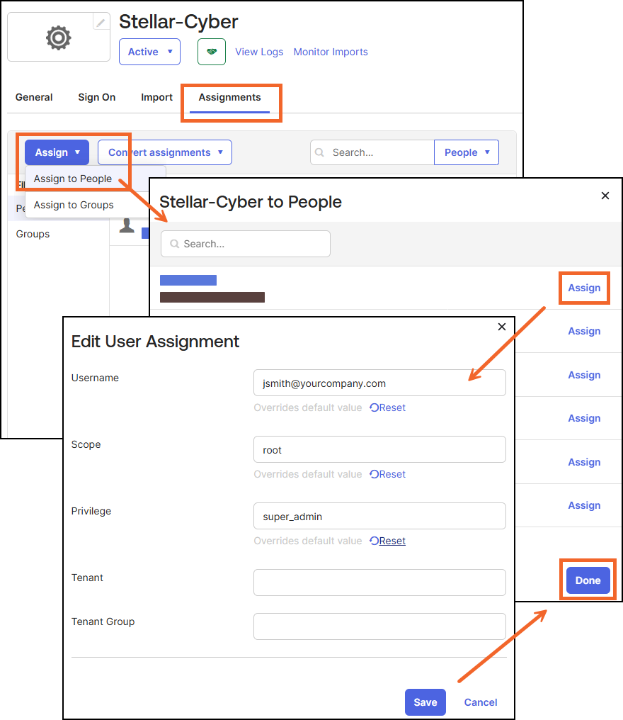 10. Repeat the assignment for all users whom you want Okta to authenticate when they access Stellar Cyber.