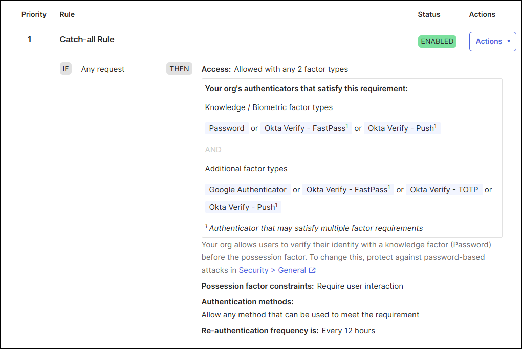 Okta automatically adds Google authenticator to the Catch-all Rule, which is applied by default to all applications. The rule requires any two factor types for users to authenticate themselves, such as a password and a code from Google Authenticator.