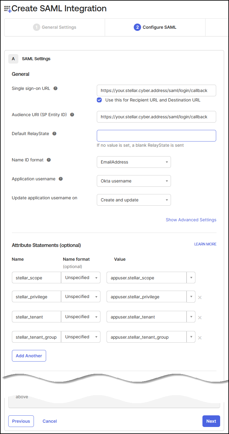 • https://your.stellar.cyber.address/saml/login/callback/cust_id/<tenant-id>