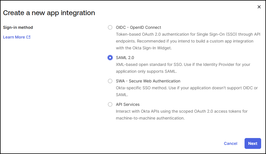 3. On the Sign-in method page, select SAML 2.0 and then select Next.