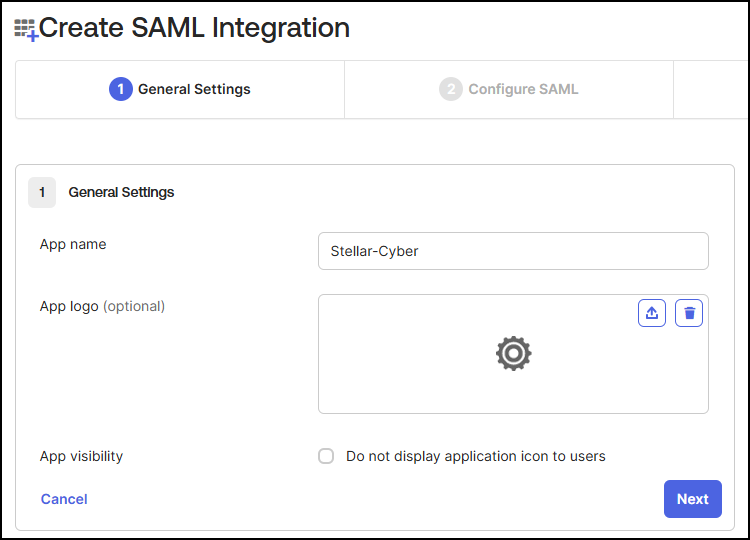 4. On the General Settings tab on the Create SAML Integration page, enter an App name, optionally upload a logo, and then select Next.