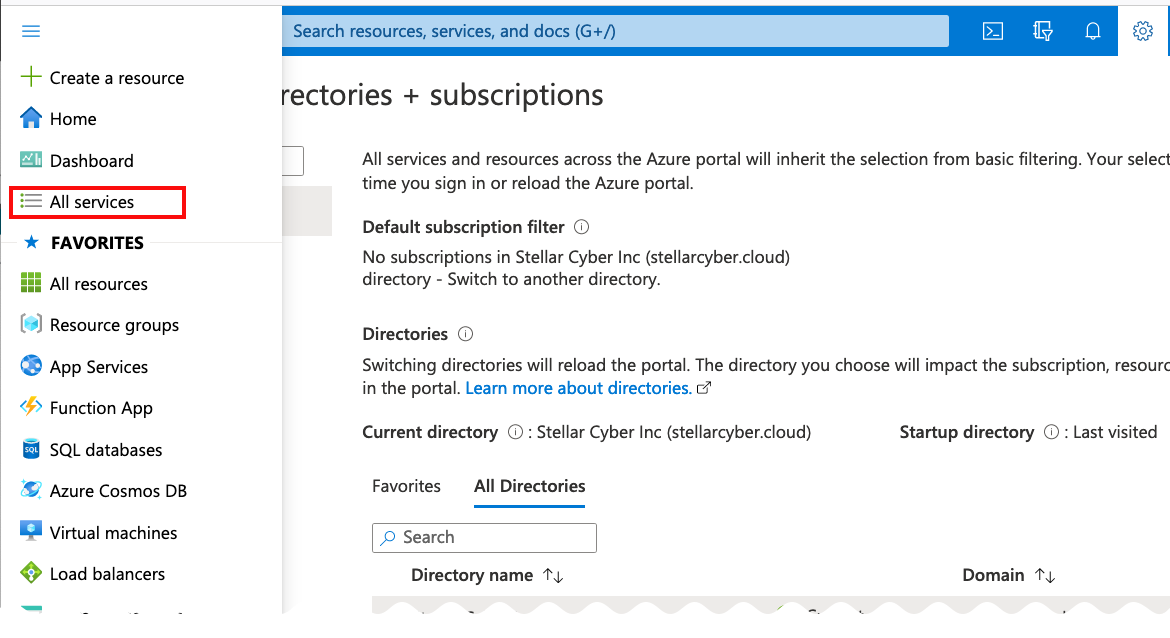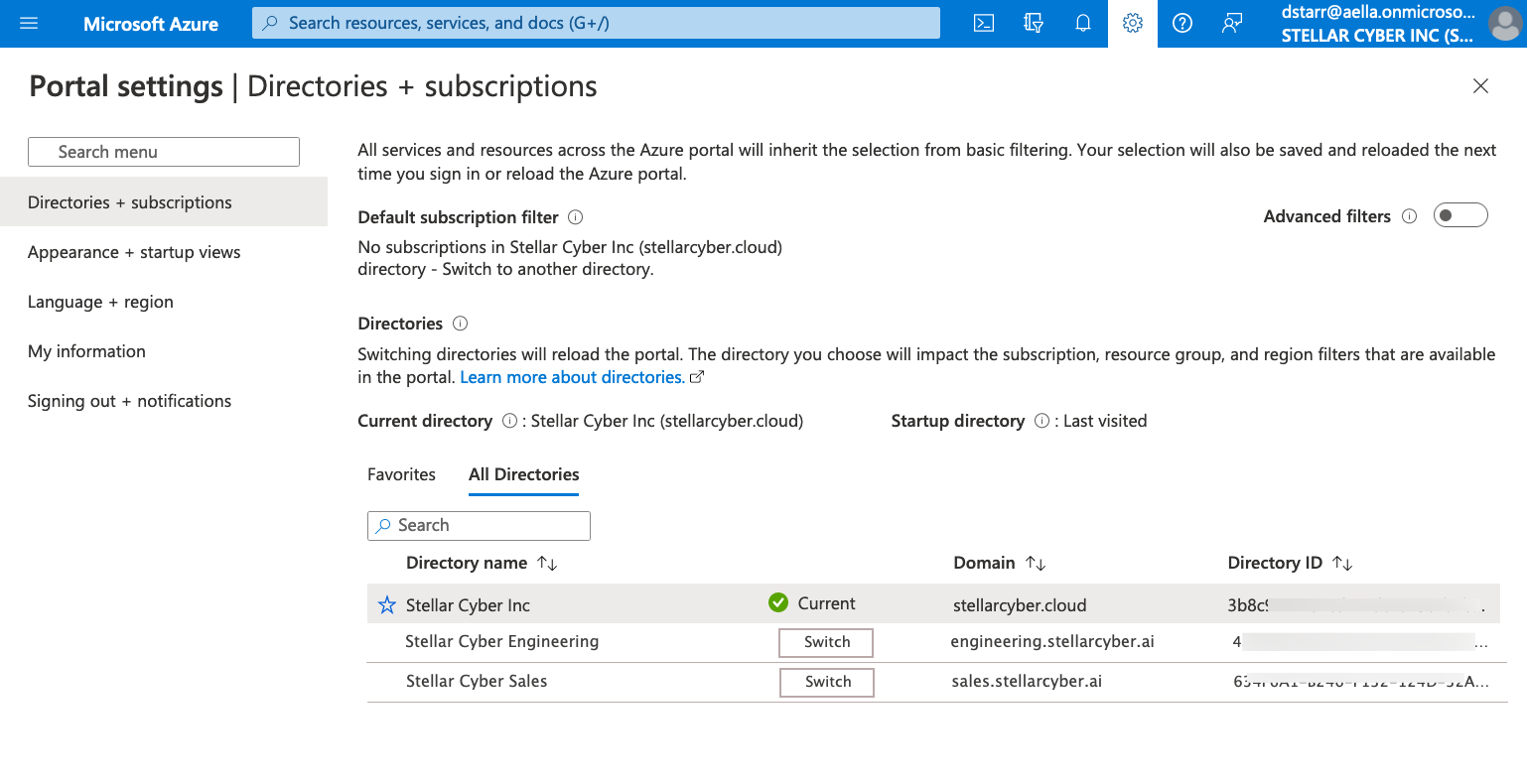 2. Ensure you have selected the Azure AD B2C directory that contains the Microsoft Entra ID (formerly Azure AD) tenant that will be used to access Stellar Cyber. Navigate to the Directory selector using one of the following options: