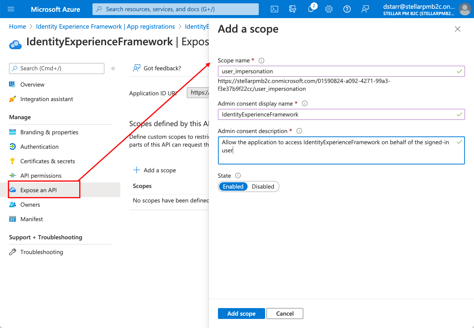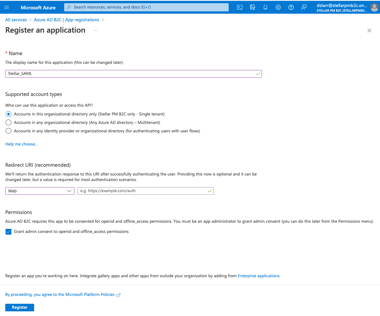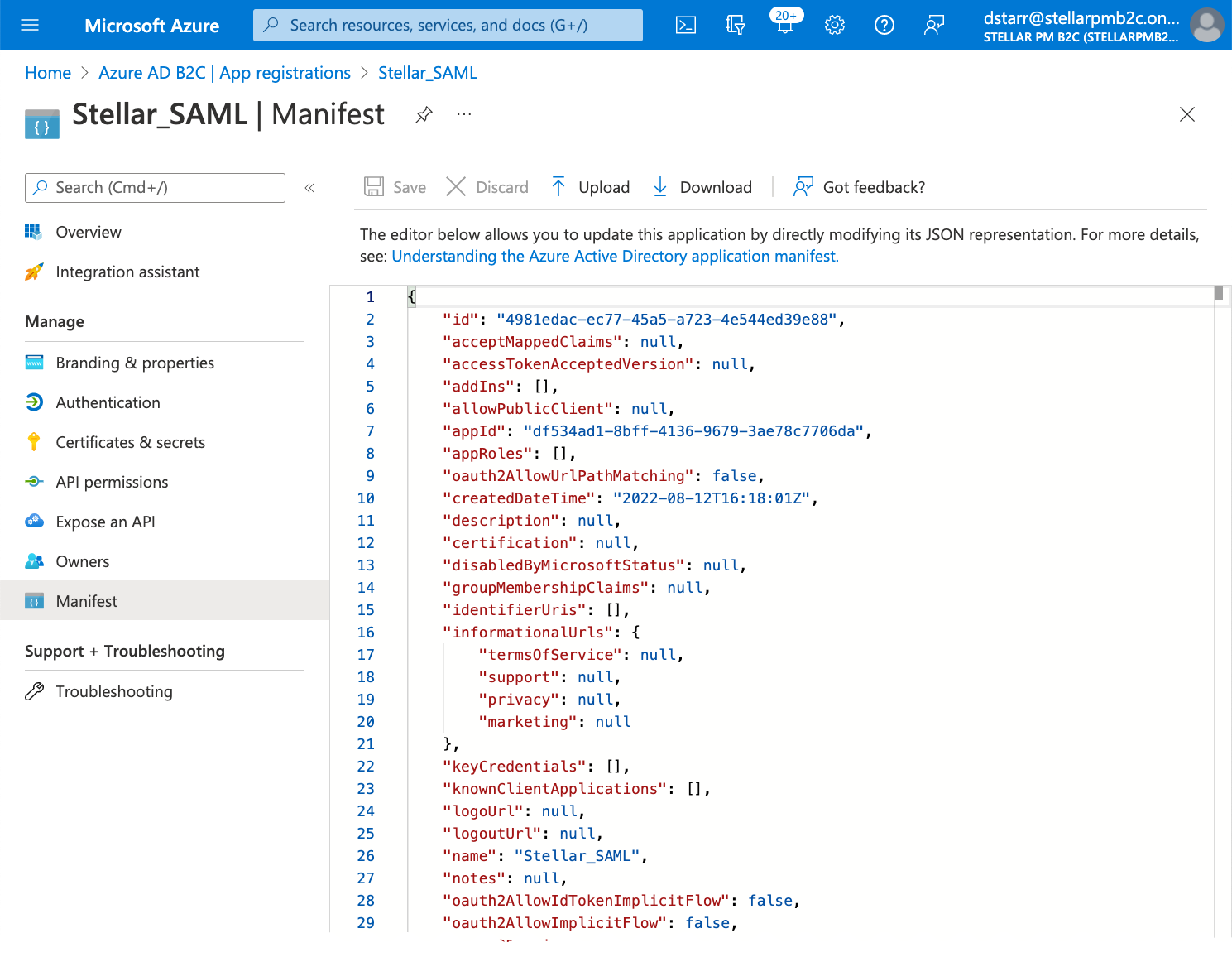 "identifierUris": ["https://stellarpmb2c.onmicrosoft.com/Stellar_SAML"],