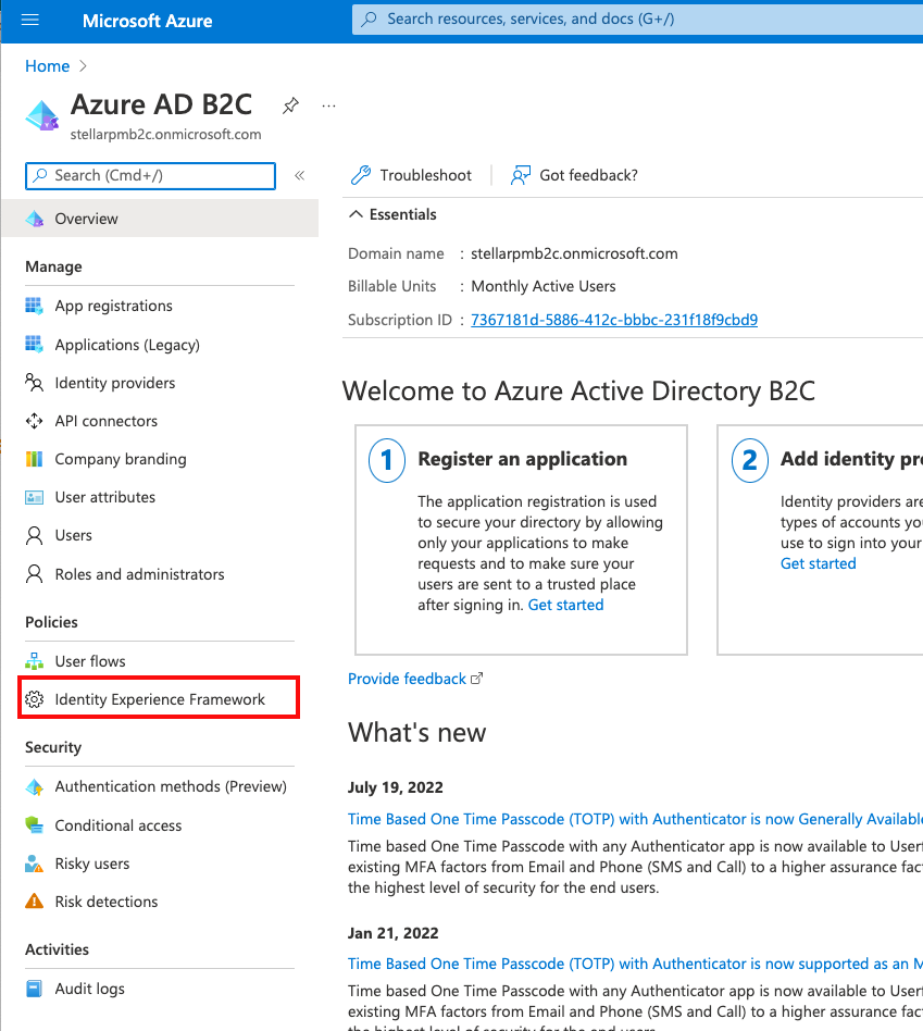 3. From the left navigation section for Policies, select Identity Experience Framework.