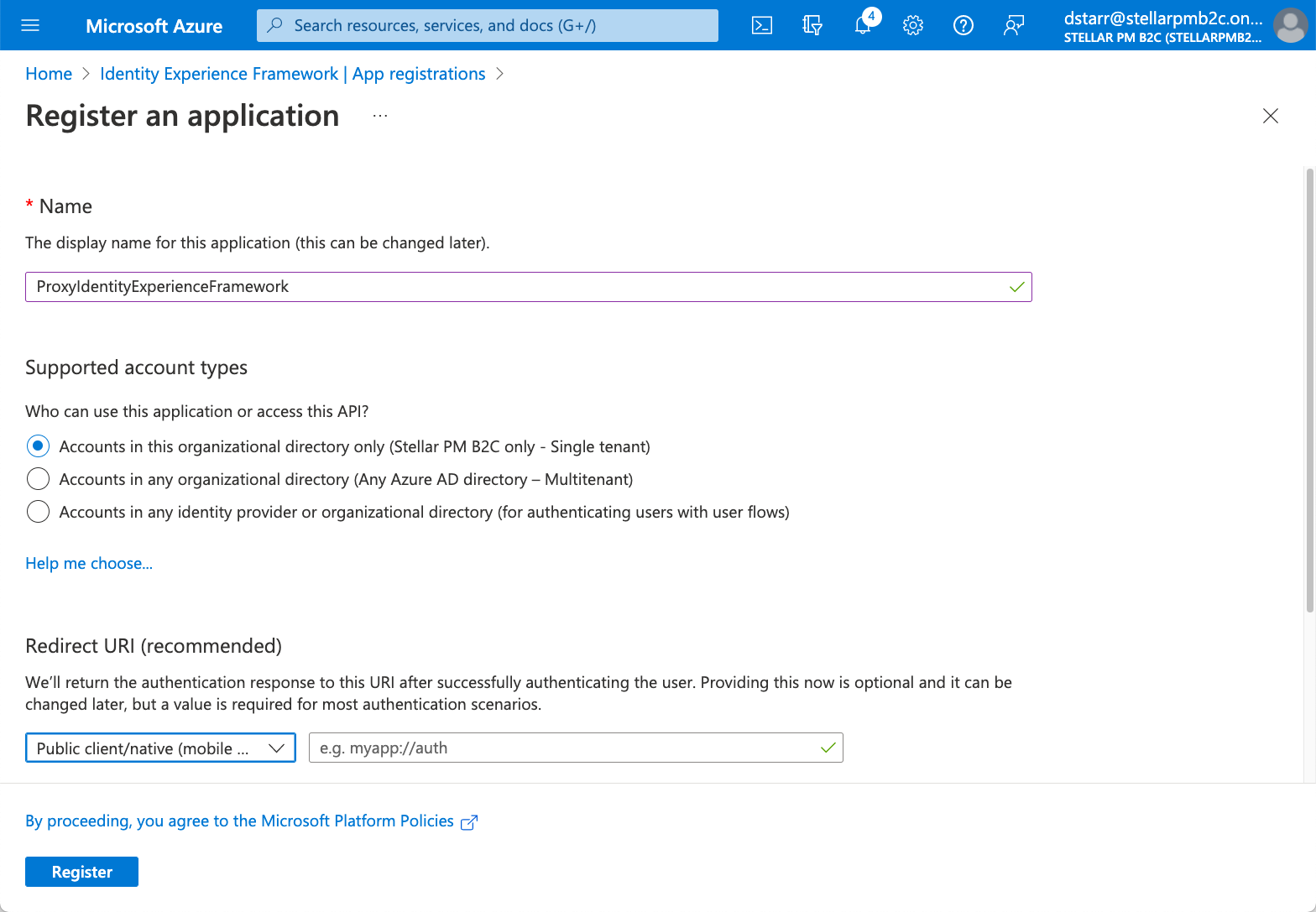 If you stop and return to any of the procedures in this configuration process, ensure that you switch to the correct directory before you continue so that you are working on the correct Azure AD B2C Tenant container.