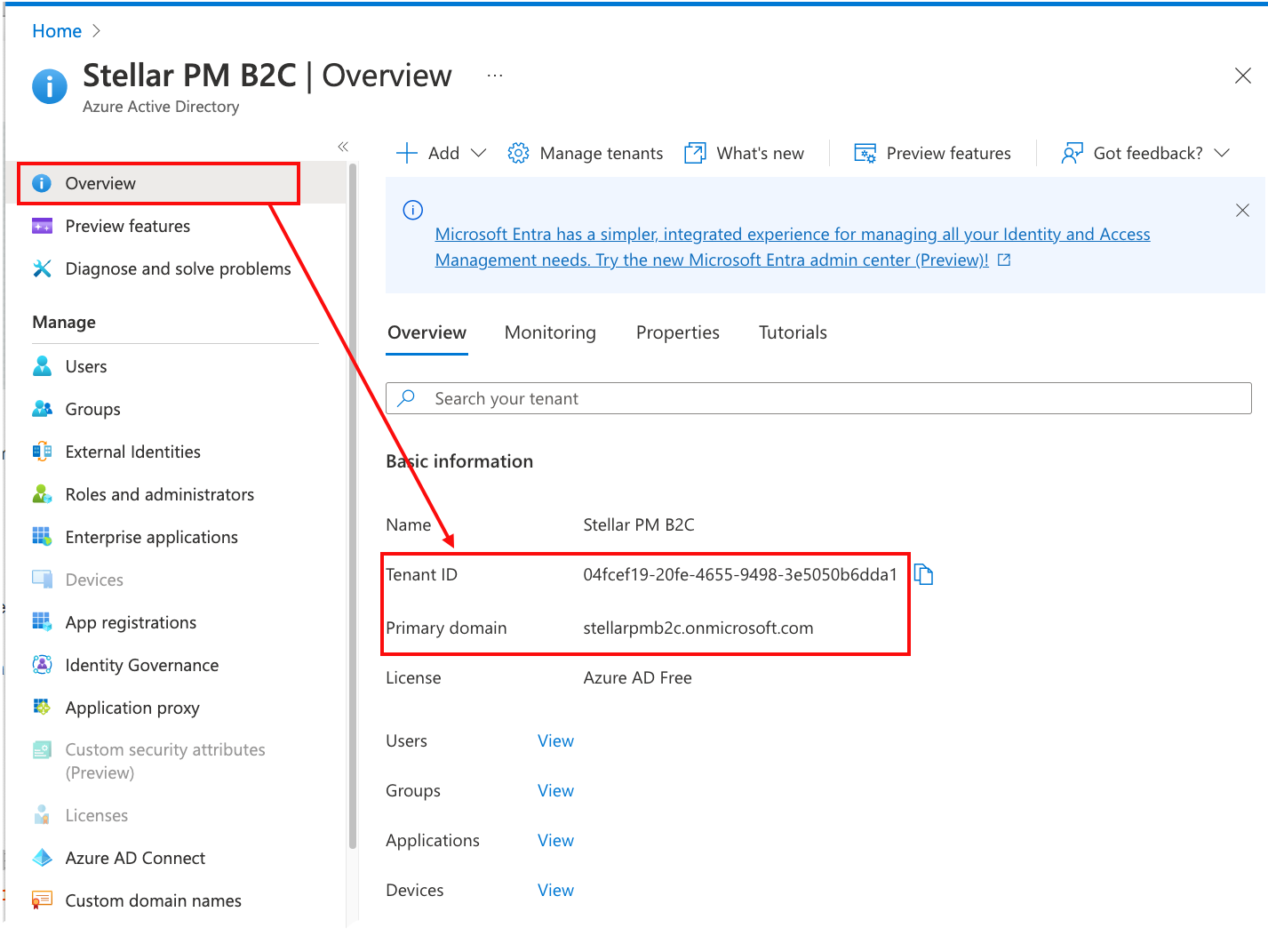 4. Now obtain the account identifying details that you will use throughout this configuration process. Navigate to the Microsoft Entra ID > Overview page.