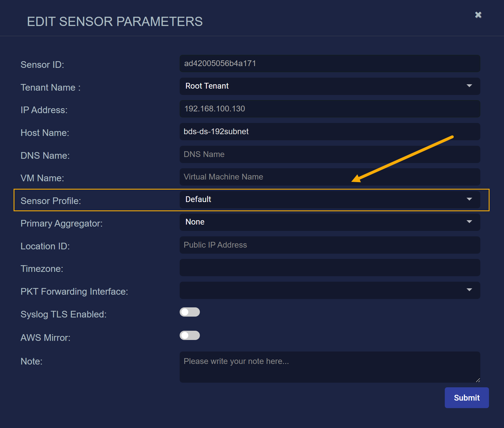 3. Use the Sensor Profile dropdown to assign the Modular Sensor profile with the Aggregator feature enabled that you configured in the previous procedure.