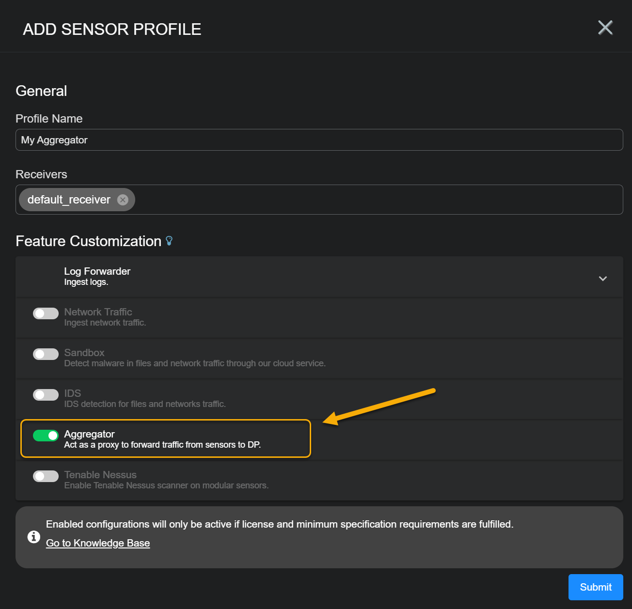 1. Create a Modular Sensor profile for the aggregator in the System | DATA SOURCE MANAGEMENT | Sensor Profiles tab. Ensure that the Aggregator feature is enabled in the Modular Sensor profile.