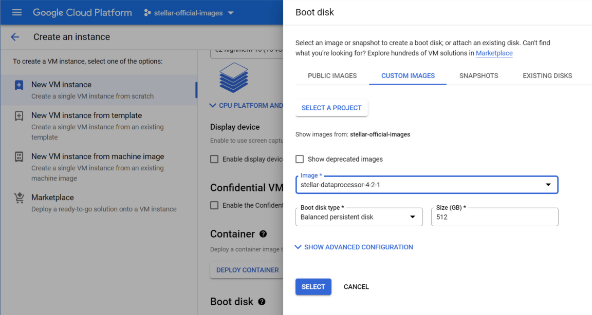 10. Click the SELECT A PROJECT button and choose the stellar-official-images project.