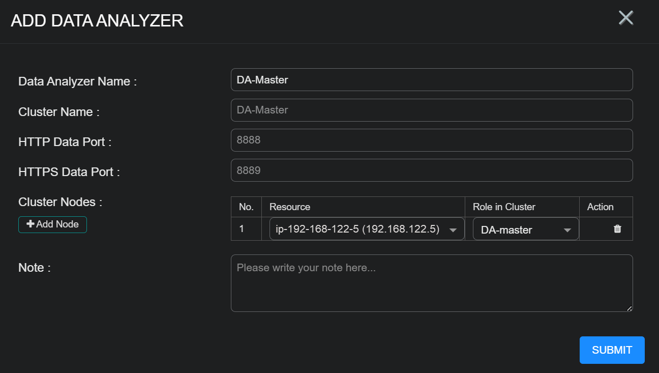 Cluster Nodes – Click the Add Node button and use the Resource dropdown to select the da-master. Then, set the Role in Cluster dropdown to DA-Master and click Submit, as in the figure below.