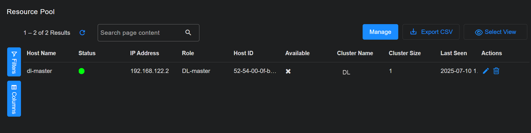Navigate to the System | DATA MANAGEMENT | Resources page and verify that the DL-m VM is listed with a Role of DL-master and the Cluster Name you specified in the CLI. For example: