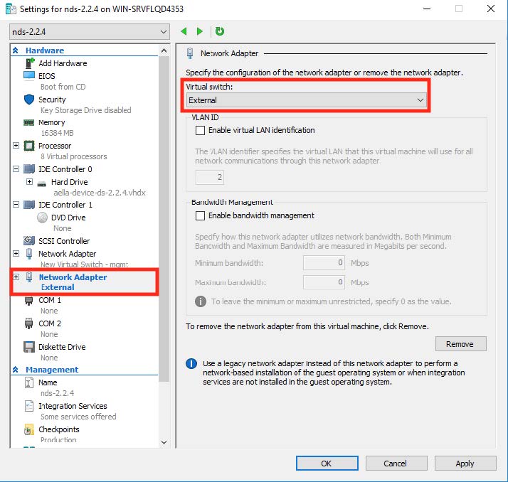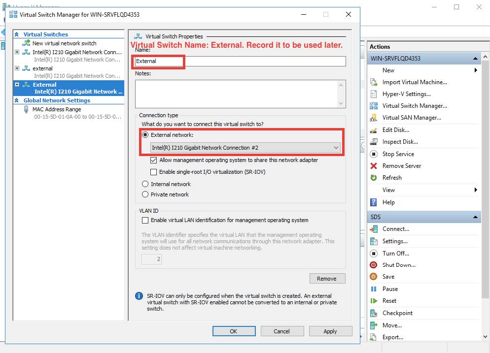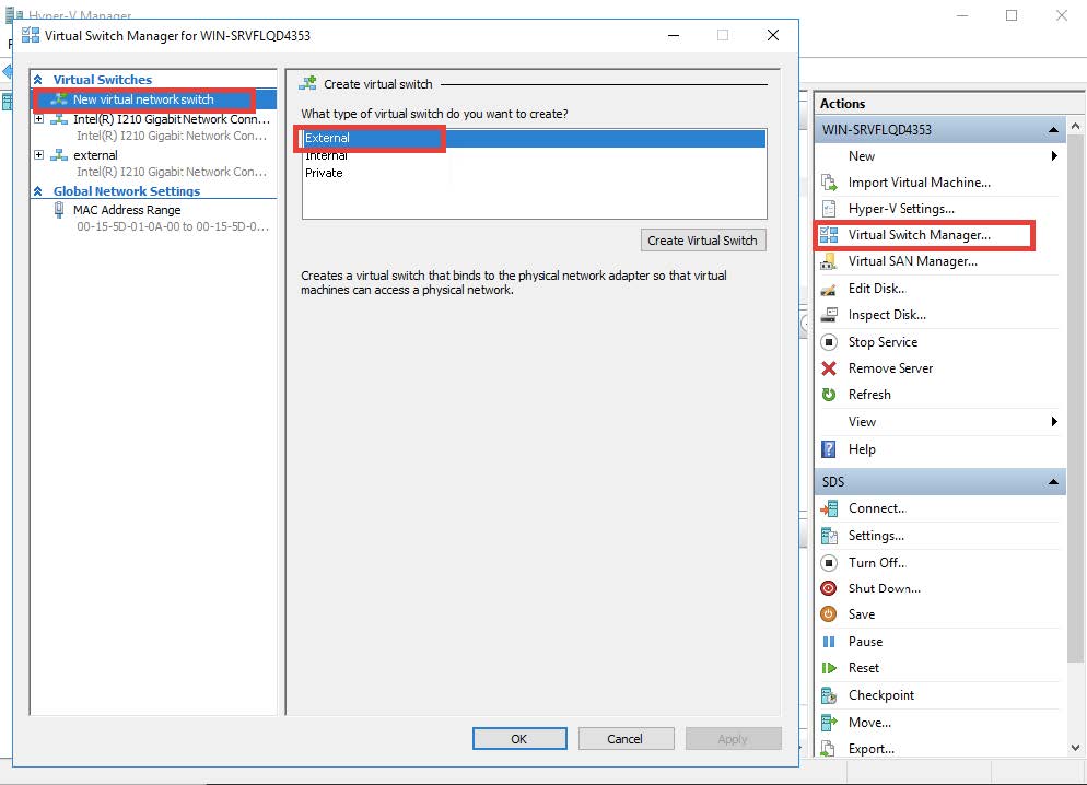 Start the Hyper-V manager and open the Virtual Switch Manager from the right-hand sidebar. Select Create Virtual Switch then choose External Network. The resulting display is shown in the following image.