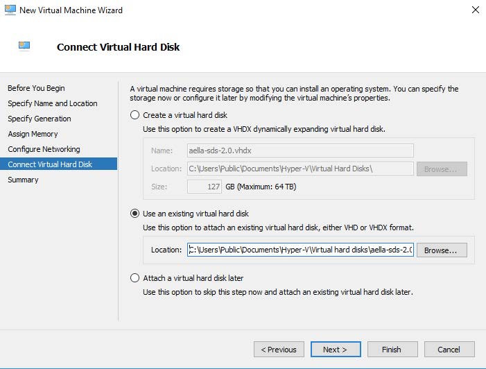 Connect the Virtual Disk image that was downloaded in the site preparation mentioned above. In the dialog box use the Use existing option as shown in the following image. If the image was placed in a different location adjust the Location field appropriately.