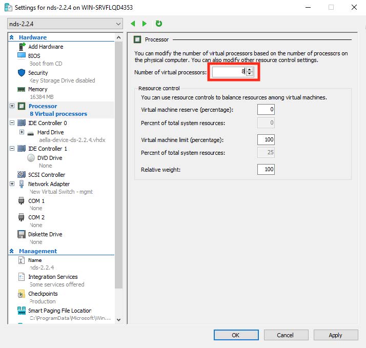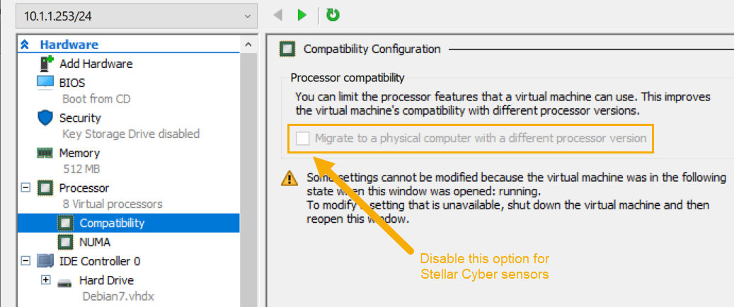 Stellar Cyber sensors deployed in Hyper-V must have the processor compatibility feature disabled to ensure that the SSSE3 instruction set can be used and that aella_flow runs properly. Although the sensor VM starts and appears to run correctly with processor compatibility enabled, stability issues will eventually occur due to high CPU usage.