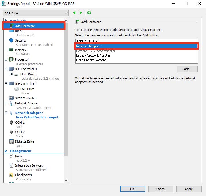 The aggregator requires a connection to the virtual switch that we created in the first steps. Click Add Hardware | Network Adapter as shown in the following image. Note that you can only add a network adapter to the VM while it is powered off.