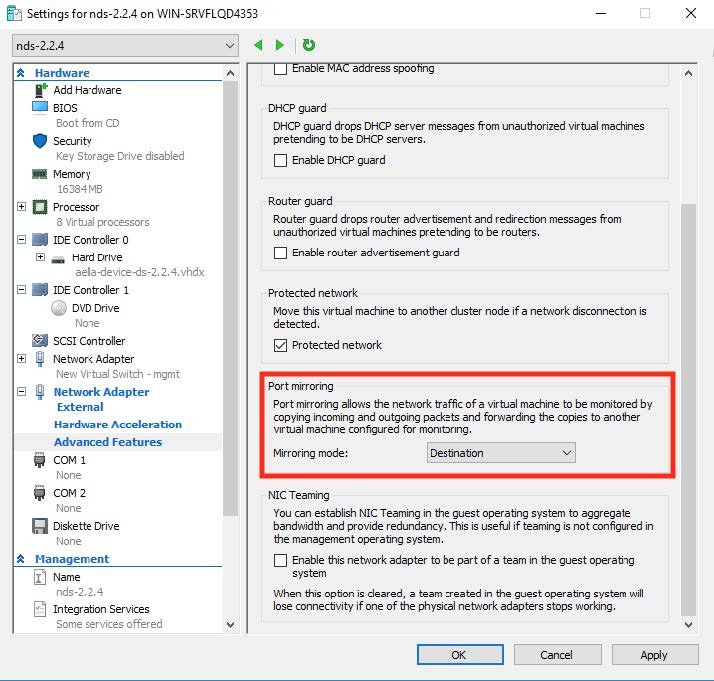 Expand the associated network adapter and click Advanced Features. Set the mirroring mode of the aggregator to Destination. This is shown in the following image.