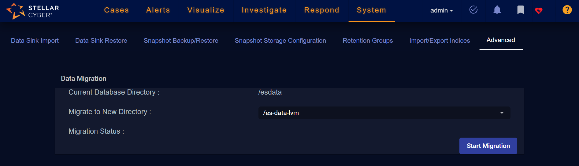 Set the Migrate to New Directory option to the secondary storage you attached in the CLI (/es-data-lvm).