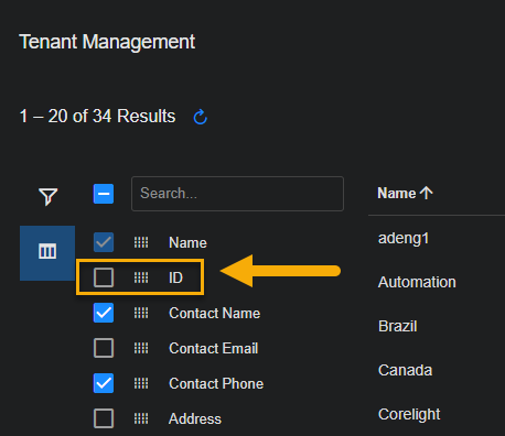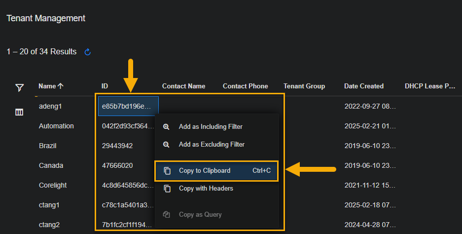 Right-click the entry in the ID column for the tenant whose ID you want to copy and choose Copy to Clipboard from the context menu that appears. For example: