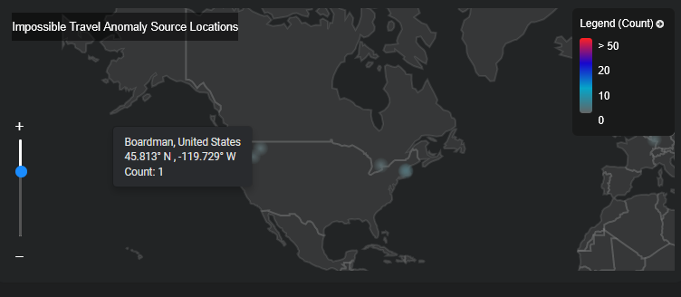 This display plots the location information of the events onto a world map. This provides a quick overview of where threats are coming from.