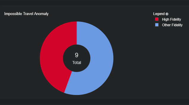 The Alerts by Fidelity graph breaks out the number of alerts for the selected alert type according to their fidelity category in a pie chart. Separate slices are provided for High Fidelity alerts (those with a Fidelity Score greater than 75) and all other alerts slice size is adjusted to the proportion of alerts in the corresponding category. The total is shown in the innermost circle.