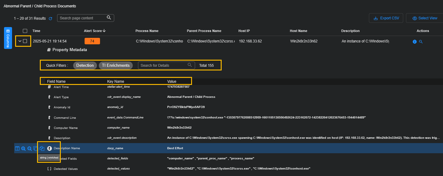 Quick Filters for Detection and TI Enrichments, described in Using the Alerts Page.