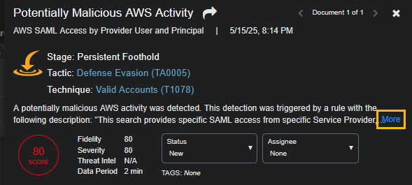 If the alert description is long, click the More button to display the full alert description. After the alert description is expanded, the button toggles to Less.