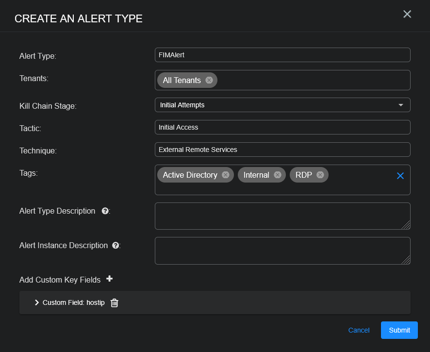 Kill Chain Stage, Tactic, Technique, Tags, and Description are all pre-filled based on the custom alert type settings.