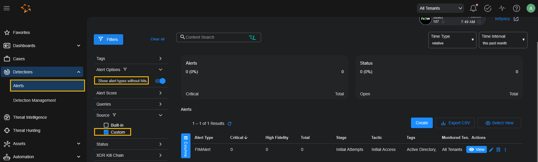 Ensure that the Alert options | Show alert types without hits option in the Filters panel is enabled and locate your new custom alert type in the Alerts table.