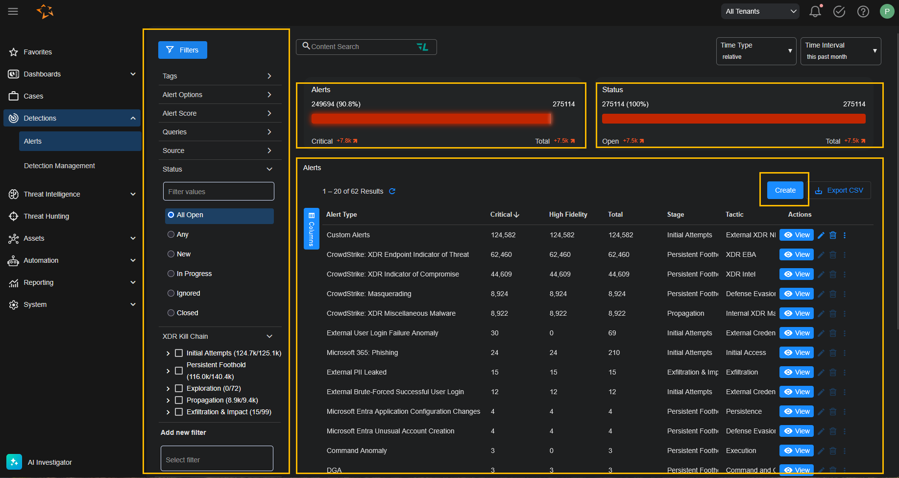 Select Detections | Alerts to navigate to the Alerts page. This page allows you to view observed alerts organized by the XDR Kill Chain and analyzed with machine learning. From here, you can also access alert details and create custom alert types. Stellar Cyber generates alerts by using machine-learning algorithms to search for specific security-related events. You can get to the Alerts page by: