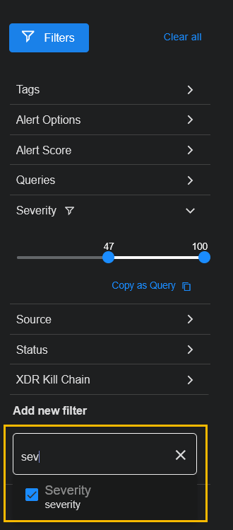 Depending on how you arrived at the Alerts page, some of the display filters may already be set for you. For example, if you drilled to Alerts by clicking an XDR Kill Chain stage in the home dashboard, the corresponding stage is already selected as a filter. You can set the following types of filters in the Filters panel: