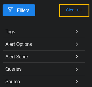 The Filters panel provides a collapsible set of display filters that can be applied to the Alerts page. Click the Filters button at the top left of the display to toggle the Filters panel open and closed.