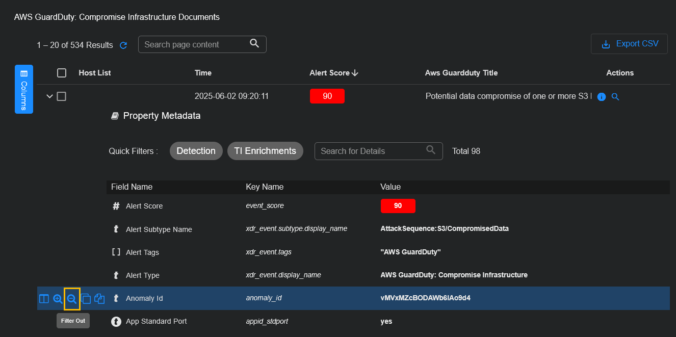 You can apply quick filters to control which Interflow key-pairs are displayed and perform searches. You can apply quick filters to display only detections, only TI (Threat Intelligence) enrichments, or both. When you don't apply a filter, you see all the key-value pairs for an alert.