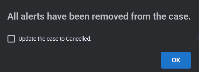 After you remove all alerts from a case, Stellar Cyber asks if you want to set the case status to Cancelled, as shown below: